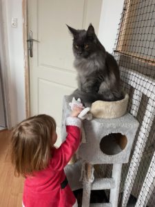 - J’accueille les chats à l’étage, seuls dans une des chambres à leur arrivée, pour qu’ils puissent s’adapter au mieux. Ils mettent généralement 12h à 24h pour être à l’aise et découvrent ensuite les autres pièces (en tout, 3 chambres pour eux dont une grande salle de jeux, la mezzanine ensoleillée et la salle de bain que certains apprécient beaucoup !). Les chats disposent d’environ 60 m2 dans la maison.